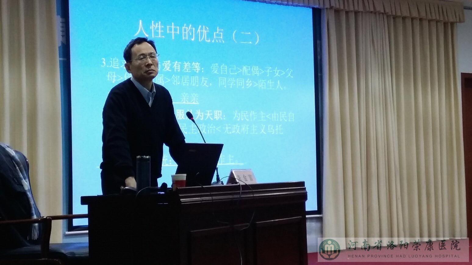 朱金富教授长期从事文化心理的研究和应用,他从中国传统文化中人性常见的弱点和人性中的优点入手,运用大量事实和案例,全面阐述了精神文明建设在医院发展中的重要作用,强调调整好个人与集体的关系是道德的核心问题,在工作和生活中要克服弱点、发扬优点,勤奋勇敢、见义勇为,大公无私、吃苦耐劳,互助合作、友爱、同情,正直、诚信、善良,积极弘扬和传播正能量,给大家上了一堂生动的文化教育课。