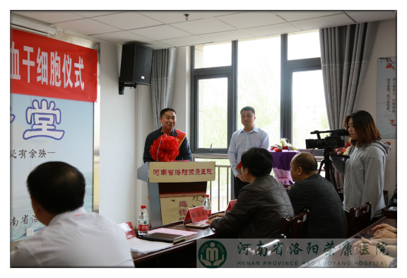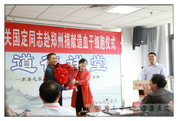 4月3日,河南省洛阳荣康医院综合楼三楼道德讲堂里,掌声不断,“欢送关国定同志赴郑州捐献造血干细胞仪式”在此隆重举行。洛阳市红十字会秘书长郑瑞生、河南省洛阳荣康医院党委书记陈国军,分别向荣康医院健康体检中心副主任关国定敬献鲜花,祝贺他赴郑州无偿捐献造血干细胞。荣康医院干部职工到场欢送,为关国定的捐献行动加油喝彩!