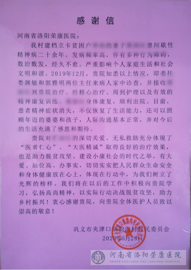 栗某是巩义市夹津口镇韵沟村建档立卡贫困户,已患精神分裂症二十余年,丈夫因患有尘肺职业病无法从事重体力劳动,婆婆年老体弱,还有两个孩子需要抚养,疾病、贫困压得这个五口之家难以喘息、生活艰苦、困难重重。省档案局驻村第一书记了解这一情况后,积极为栗某寻求医疗救助办法。2019年12月,一个偶然的机会,我院得知了栗某的患病情况,即选派主任医师郭雅明、副主任医师娄渊敏登门入户,为栗某提供专业诊疗。经两位专家诊断,决定让栗某到我院一病区住院治疗。
