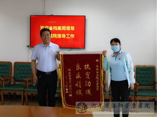 6月3日上午,在我院综合楼二楼会议室,河南省档案局受巩义市夹津口镇韵沟村村民委员会委托,向我院送上了“扶贫助残 良医精诚”的八字锦旗和感谢信,感谢我院自去年12月以来,为该村贫困户栗某提供优质医疗服务,帮助其恢复基本健康,回归家庭生活,减轻家庭负担,重拾脱贫希望。院长郎明现代表我院接受锦旗,病区主任医师蔡效红、郭雅明、副主任医师娄渊敏及办公室、医务科、护理部负责人参加仪式。