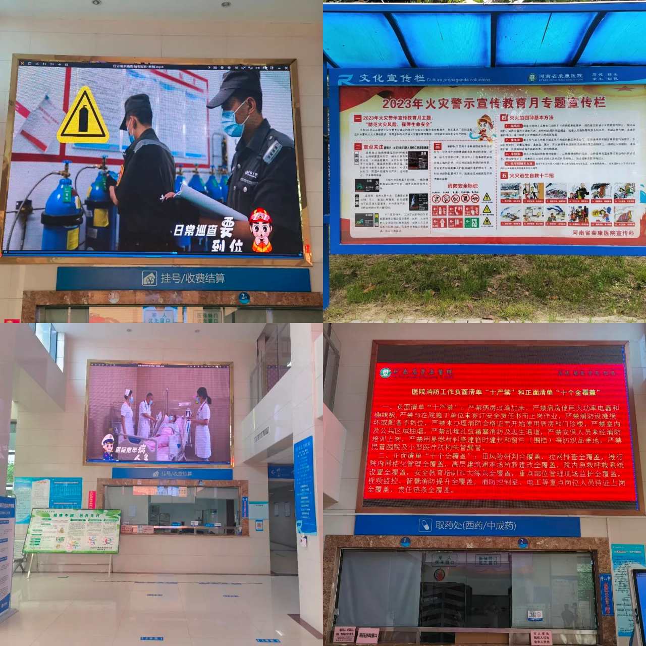 一是加强针对性火灾警示宣传教育。在院内醒目位置制作火灾警示宣传教育月专题宣传橱窗,对火灾危害性进行广泛宣传。针对近年来医院典型火灾案例,在门诊电子大屏展播医院消防宣传科普常识视频和宣传标语,强化全体职工消防安全意识。