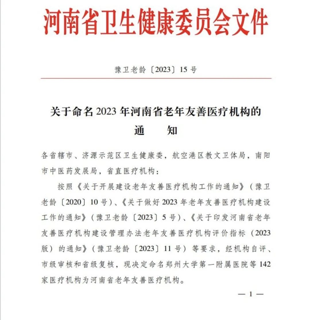 近日,河南省卫生健康委员会发布《关于命名2023年河南省老年友善医疗机构的通知》,我院经机构自评、市级审核、省级复评等层层选拔,成功获批成为河南省老年友善医疗机构。