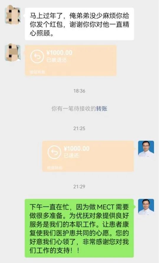 1月23日,晚上回到家,王崇医师看到了患者丁某家属发来这样一条信息“马上过年了,俺弟弟没少麻烦你,给你发个红包,谢谢你对他一直精心照顾”,后面是一个1000元的红包转账,他毫不犹豫点击了“退还”,并向家属表示:为患者提供良好服务是我们的本职工作,让患者康复是我们医护患共同的心愿,同时对家属的心意表示感谢,也谢谢家属对我们工作的支持。