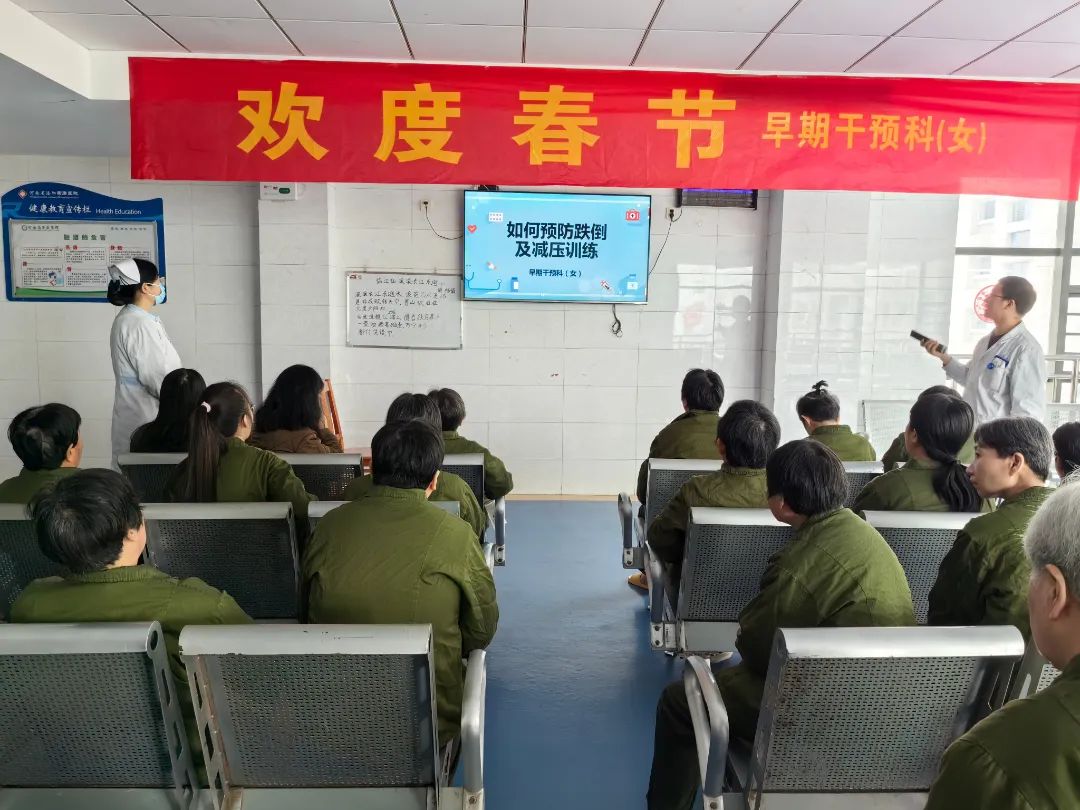 早期干预科(女)每周组织健康科普小讲堂,为全体患者系统的讲解精神科常见疾病的防治以及预防突发状况的技巧,并组织大家进行解压训练、冥想、放松操等加强心理调节的活动,帮助患者更全面了解自身疾病,加强自身调节能力,更好的促进患者康复。