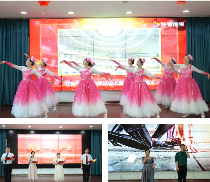 文艺汇演在全体护士长的舞蹈《党旗飘扬的地方》中拉开帷幕,广大护理工作者用深情的演唱、充满活力的舞蹈、慷慨激昂的朗诵、整齐划一的手势舞等表演充分展现新时代白衣天使朝气蓬勃、昂扬向上的新风采,赢得了现场观众阵阵掌声。情景剧《情满荣康》真实再现了退役老兵的住院康复过程,生动演绎了医务人员舍小家、为大家,大爱无疆的感人场景,是对“让军人成为全社会尊崇的职业”的生动诠释,引发了全场观众共鸣,让人动容。