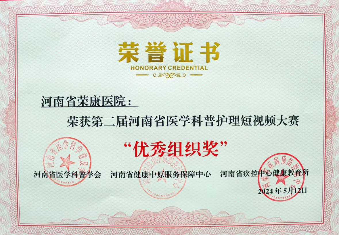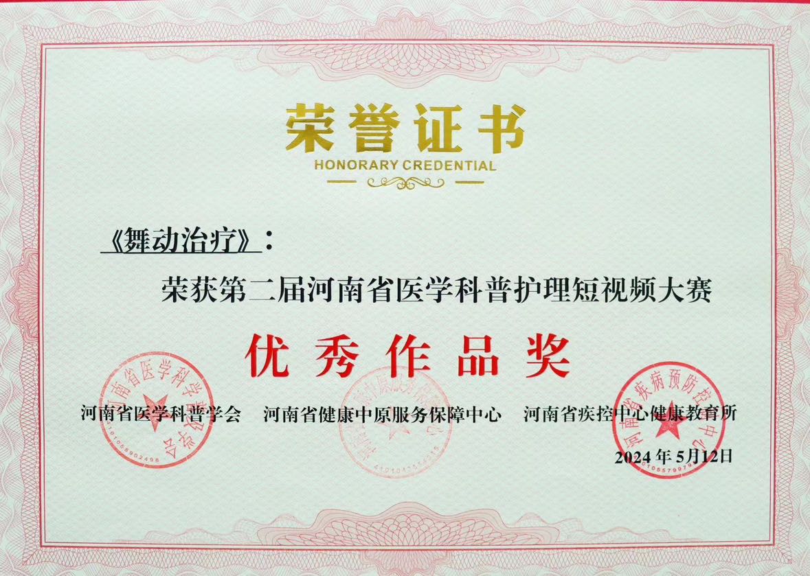 为庆祝第113个国际护士节,5月8日下午,“第二届河南省医学科普护理短视频大赛”颁奖典礼在郑州隆重举行。我院丁慧琴、王亦优、李军花、张梦兰、刘凌波的科普作品《舞动治疗》脱颖而出,荣获“优秀作品奖”,我院荣获“优秀组织奖”。