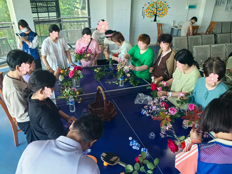 不知不觉花篮已经满了,医护人员们把患者带回病房,在活动大厅里,大家围坐在一起,互相结合,进行了插花比赛,看哪组插的花搭配的最漂亮。