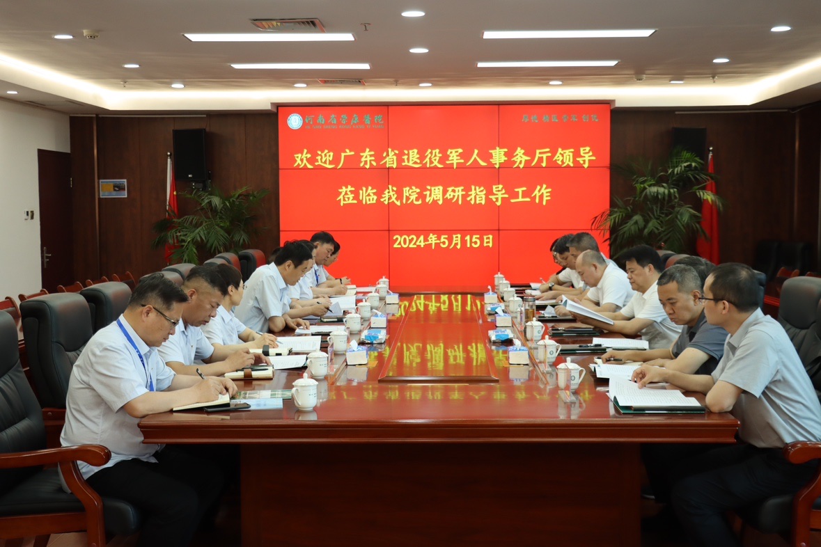 5月15日下午,广东省退役军人事务厅党组成员、副厅长董仲琪带队一行5人莅临我院调研指导工作,厅党组成员、副厅长姚国宝,厅二级巡视员、人事处处长陈荣光,院领导班子成员及相关科室负责人陪同调研。