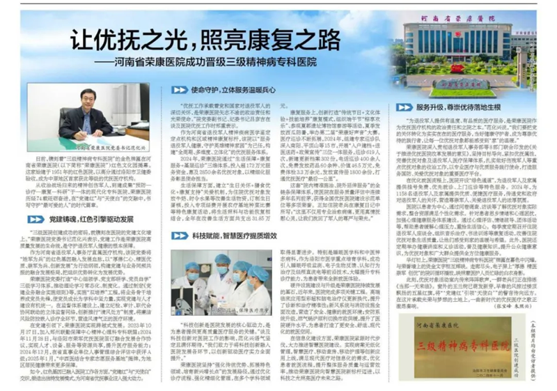 党建铸魂,红色引擎驱动发展 “三级医院创建成功的密码,就镌刻在医院的党建文化墙上。”荣康医院党委书记范化兴表示,党建工作是荣康医院高质量发展的生命线,是守护退役军人健康的根本保障。 作为河南省退役军人事务厅直属医疗机构,该院党委将 “姓军为兵”的红色基因融入发展血脉,以“厚德仁心、精医优质、崇军为兵、创新发展”为行动纲领,构建党建与业务同频共振的融合发展格局,把组织优势转化为发展优势。 荣康医院党委打造“中心组领学、党支部研学、党员自学”三级学习体系,推动理论学习常态化、制度化。通过制定《党建业务融合实施细则》等制度,实施“双培养”工程,将业务骨干培养成党员先锋,使党员成长为学科中坚力量,实现党建与人才建设有机统一。在监督体系建设上,建立纪检、审计、职代会协同联动的立体监督网络,创新推行“清风处方”制度,将廉洁风险防控嵌入诊疗全环节,营造风清气正的医疗环境。 在党建引领下,荣康医院实现跨越式发展。2023年10月27日,加入郑州联勤保障中心精神心理科专科联盟;2024 年11月28日,与洛阳市荣军优抚医院签订融合发展合作协议,实现人才、设备、服务等资源共享,提升医疗服务能力;2024年12月,在省直事业单位人事管理综合评估中获评A 级;2025年1月,“中西医结合专家志愿服务基地” 揭牌,为地区居民健康带来更多福祉。 如今,“红色基因”融入医院工作各方面,“党建红” 与“天使白”交织,锻造出独特发展模式,为河南省优抚事业注入强大动力。