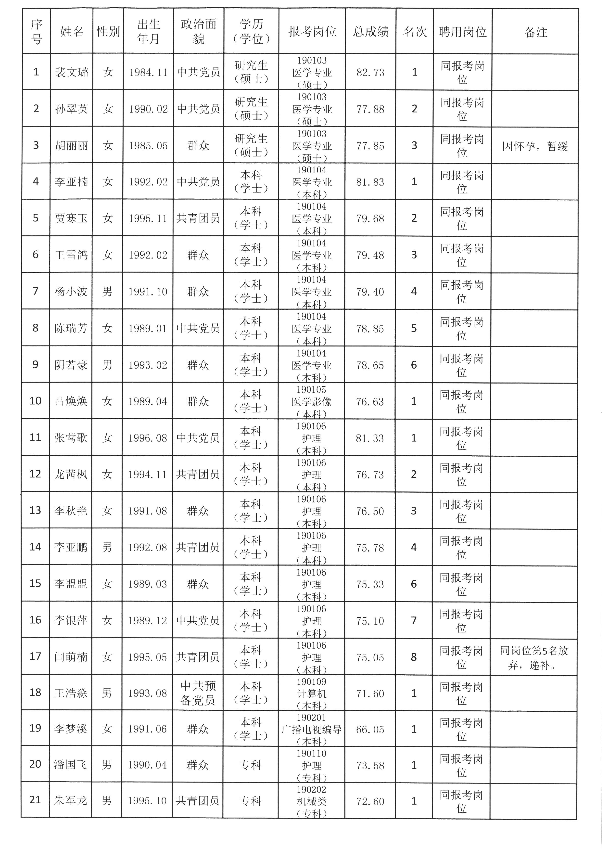附件:河南省洛阳荣康医院2019年公开招聘拟聘用人员名单