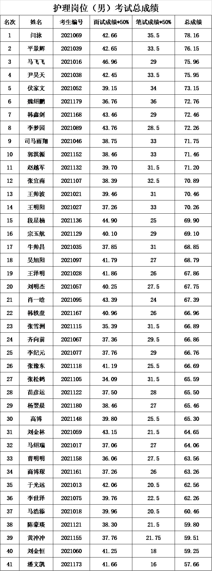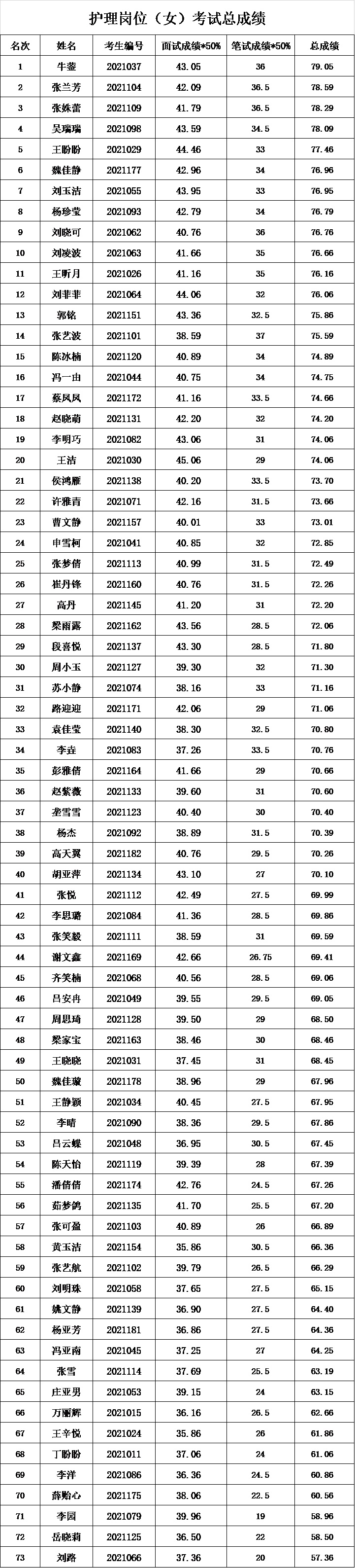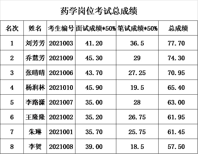 根据《河南省洛阳荣康医院2021年非在编人员公开招聘公告》有关安排,笔试、面试工作已结束,现将各招聘岗位考生考试总成绩公告如下: