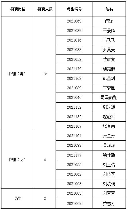 根据《河南省洛阳荣康医院2021年非在编人员公开招聘公告》有关安排,笔试、面试、体检工作已结束,按照笔试、面试总成绩以及体检结果,拟招聘闫泳等20名同志,现予以公示,公示期自2021年11月30日至2021年12月6日。