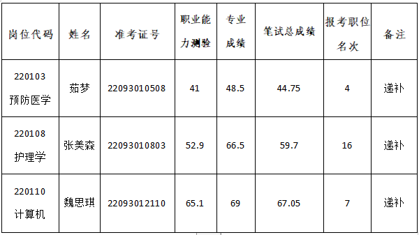 按照从报考同一职位的人员中按笔试成绩从高分到低分的顺序依次递补的规定,现将递补岗位信息及递补确认人员公布如下: